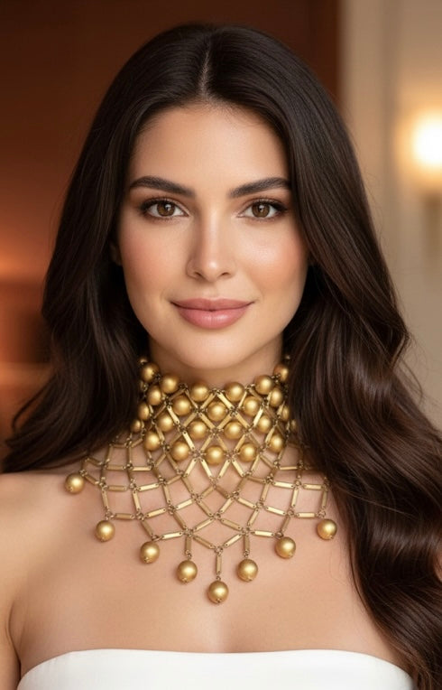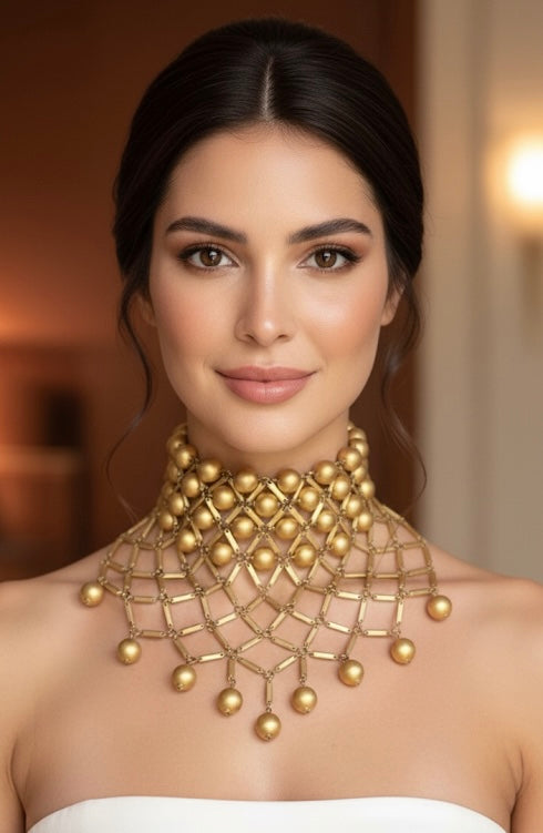STUNNING Vintage 1980's choker and earring Demi parure by POGGI Paris. Striking statement making bib necklace featuring matte white ball beads all interlinked together. Dramatic, dangling fringed bead on the bottom. Complete with the matching huggie-style clip on hoop earring in matte gold finish. Photos do not do this set justice.