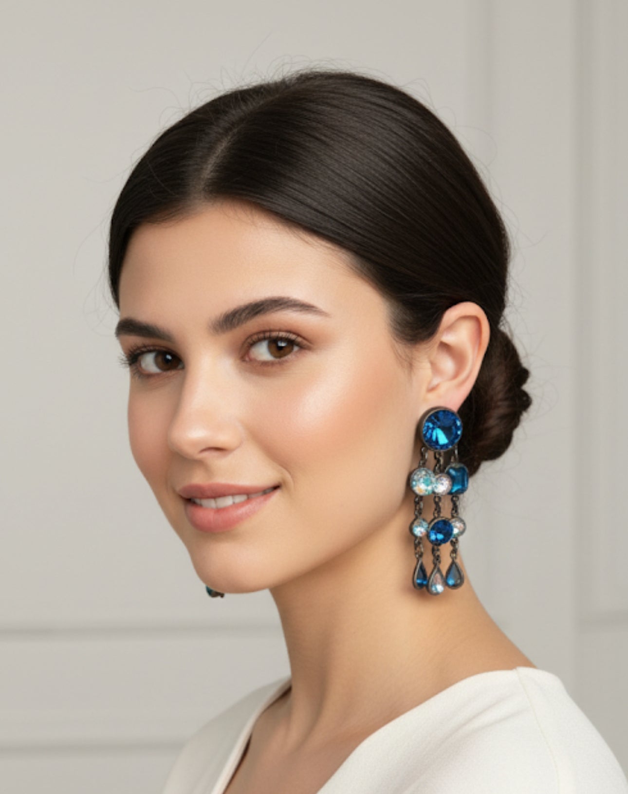 Butler & Wilson's London Fulham Road boutique was the destination for the finest costume jewelry. Everyone from Diana, the Princess of Wales to all of the fashion and film icons of the 1980s gravitated like magpies to their chamber of crystals, whimsy and glam. The sense of glamour and quality craftsmanship made by Simon Wilson is apparent in these stunning blue chandelier tasseled drops in pewter-hued metal. A total of twenty individual iridescent crystals in varying shapes and sizes play with the light to create a kaleidoscope of hypnotic beauty.