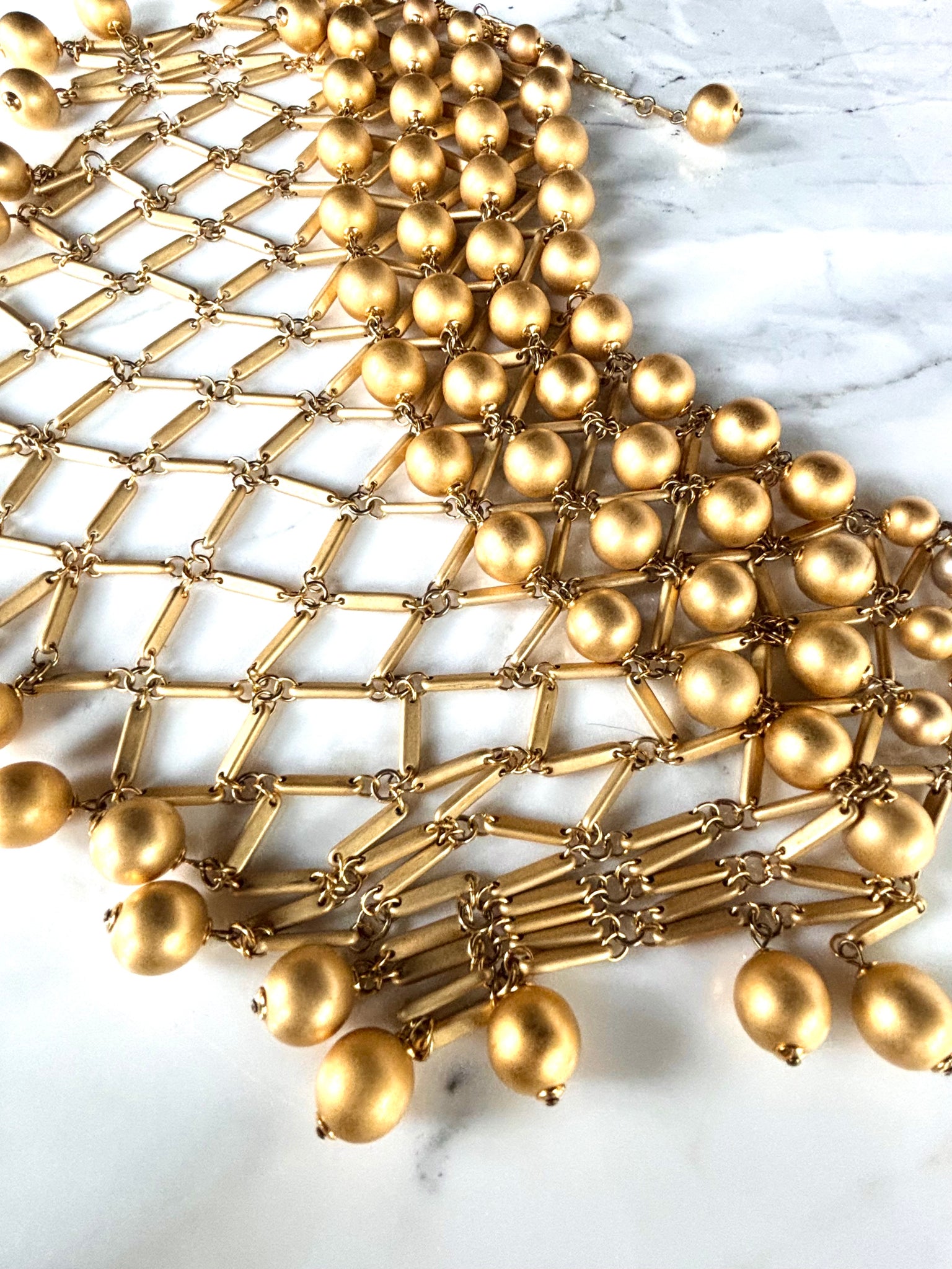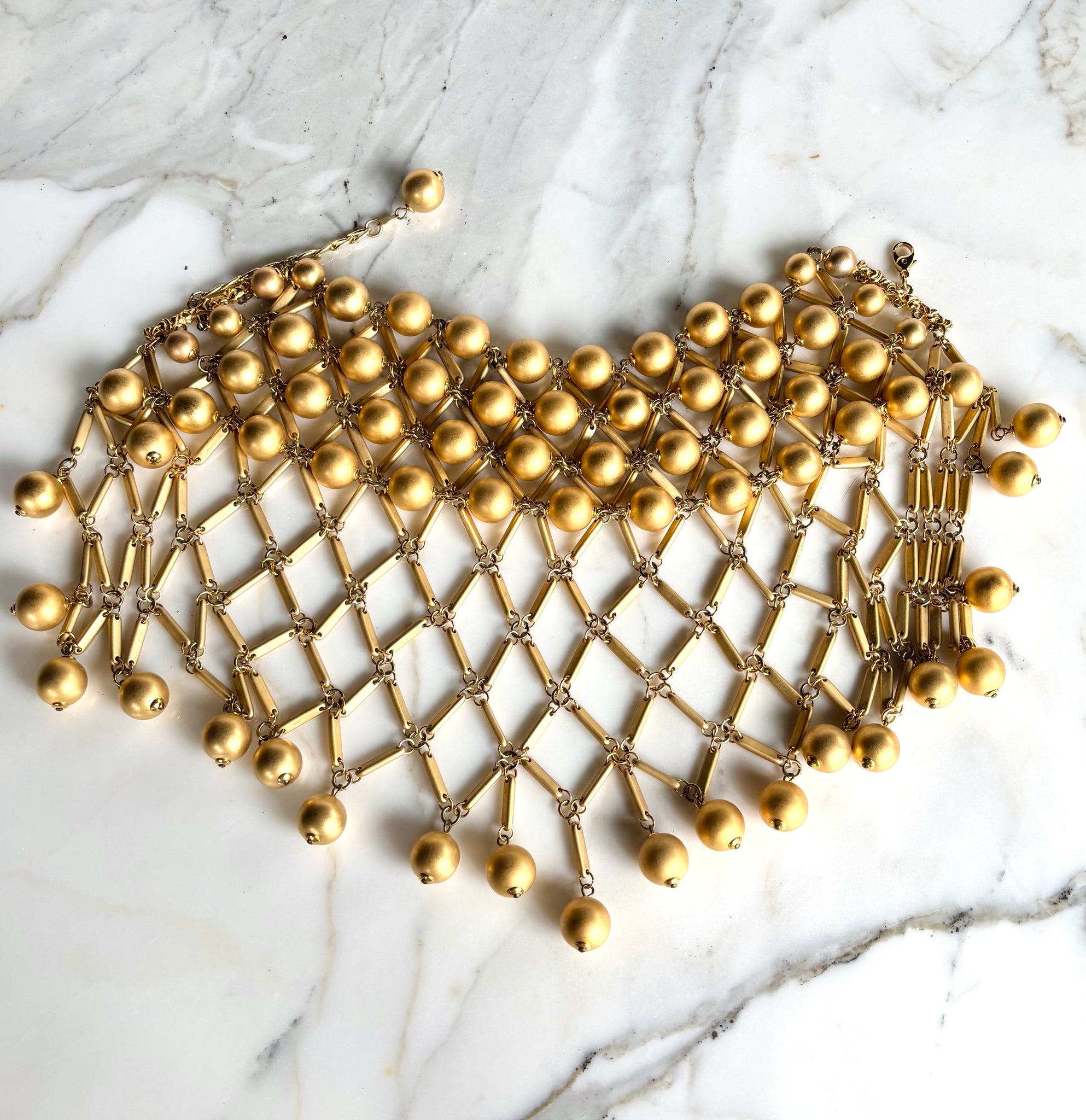 STUNNING Vintage 1980's choker and earring Demi parure by POGGI Paris. Striking statement making bib necklace featuring matte white ball beads all interlinked together. Dramatic, dangling fringed bead on the bottom. Complete with the matching huggie-style clip on hoop earring in matte gold finish. Photos do not do this set justice.